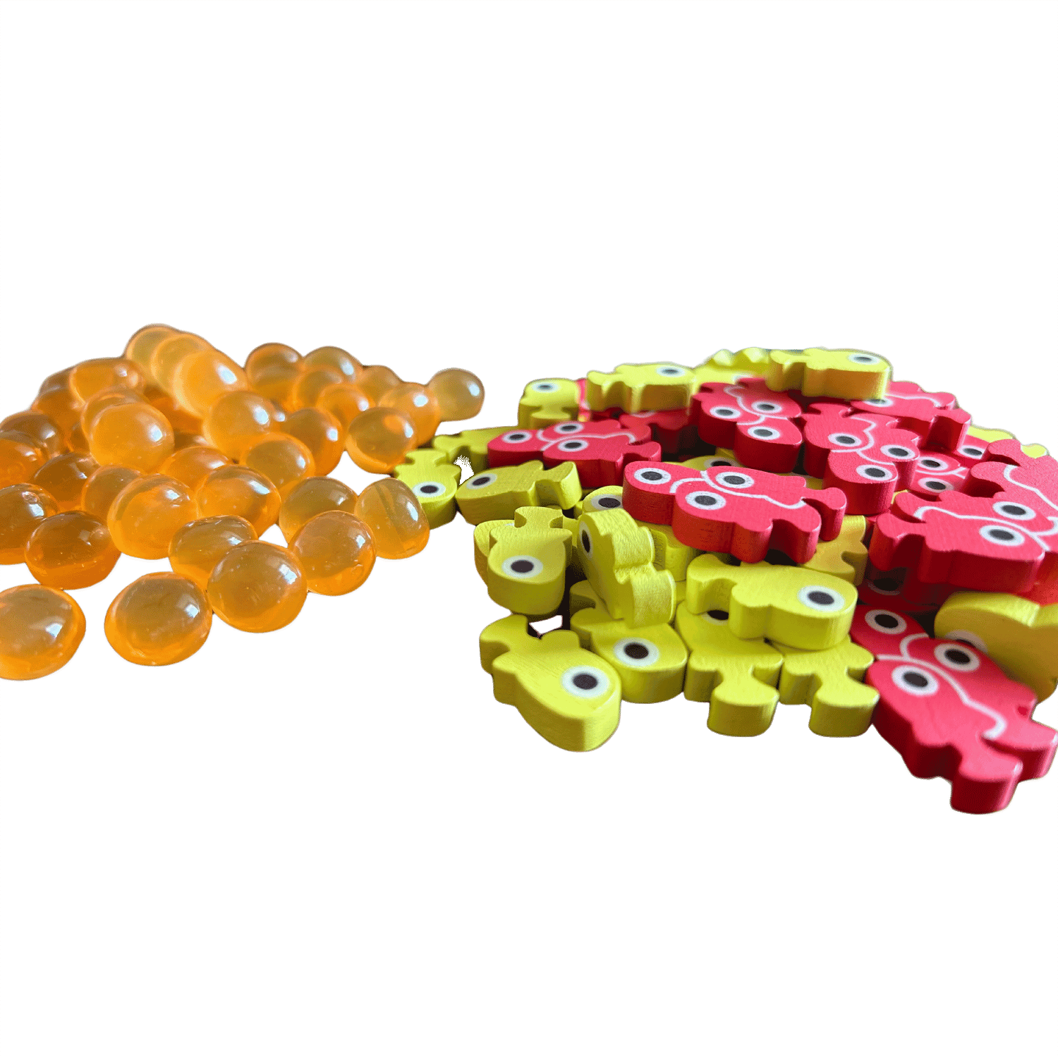 These 40 wooden young tokens, 20 wooden school tokens, and 50 squishy egg tokens (TPR plastic) were designed specifically for Finspan (the game includes cardboard tokens).