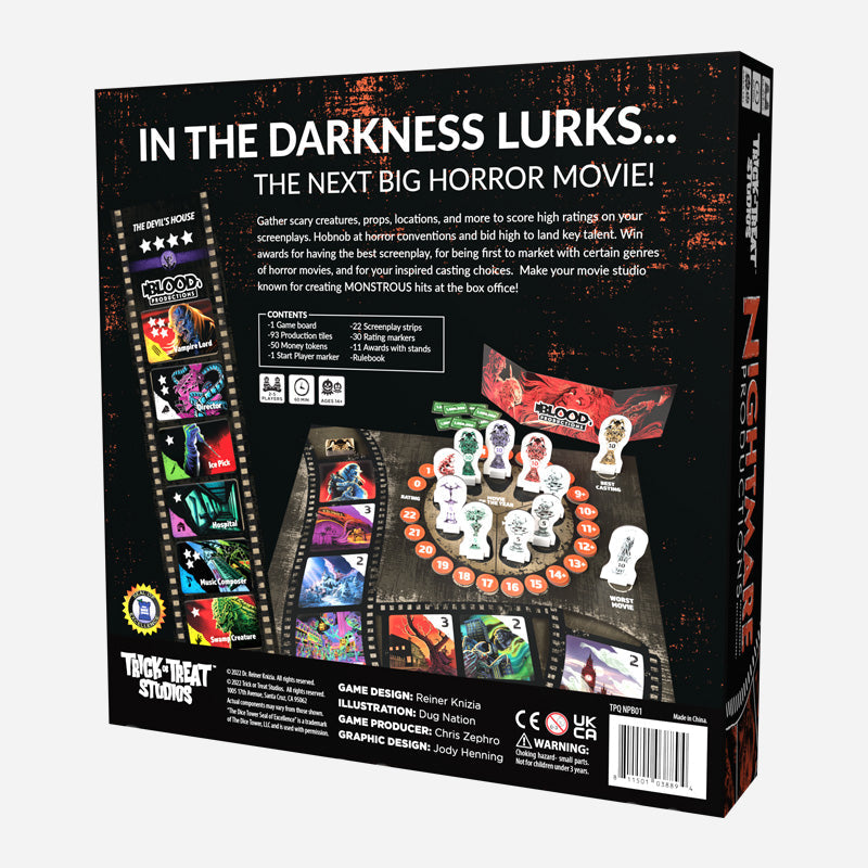 A Reiner Knizia classic - based on "Dream Factory", Nightmare Productions puts you in charge of a movie studio that specializes in horror films. Compete with other players in auctions for scary creatures, spooky props, and chilling music to complete your screenplays. Every time you win an auction, the money spent on your bid will be distributed to the other players. Manage your bids carefully so you don't give up too big of an advantage, but be aware that awards are handed out regularly for the best movies in several categories, and you don't want to fall behind there either. Whoever scores the biggest ratings and most awards will win the game! Player Count 2-5, Play Time 60 Minutes, Age Range 14+