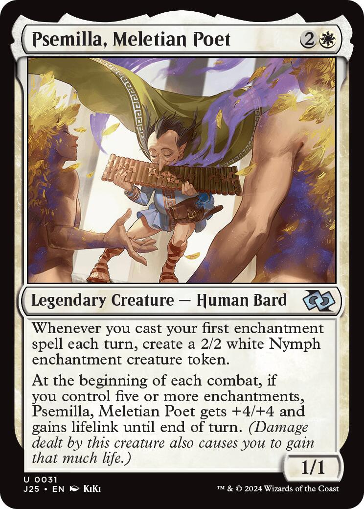- Rules Text Contains: Whenever you cast your first enchantment spell each turn, create a 2/2 white Nymph enchantment creature token. <br> At the beginning of each combat, if you control five or more enchantments, Psemilla, Meletian Poet gets +4/+4 and gains lifelink until end of turn. <em>(Damage dealt by this creature also causes you to gain that much life.)</em>