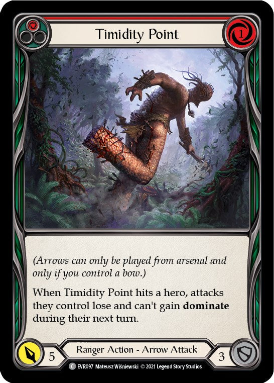 - Description: (Arrows can only be played from arsenal and only if you control a bow.) When Timidity Point hits a hero, attacks they control lose and can't gain dominate during their next turn.